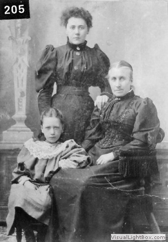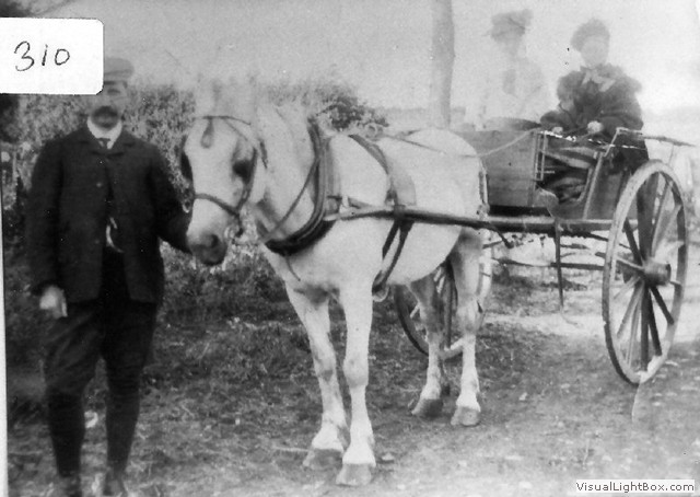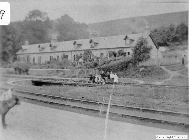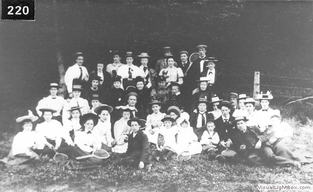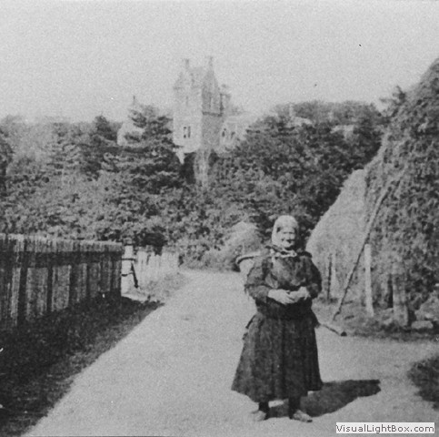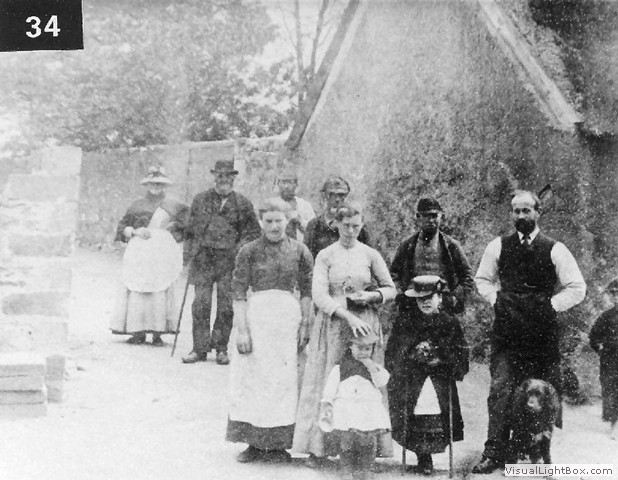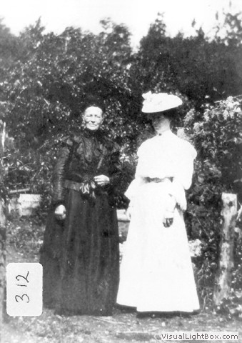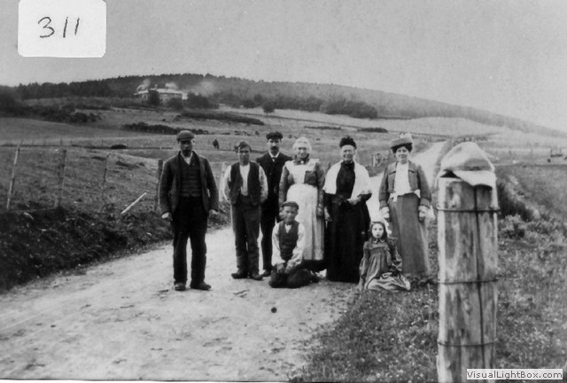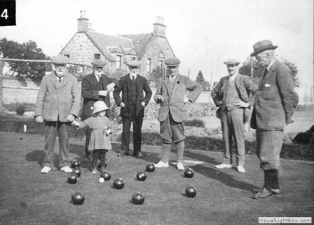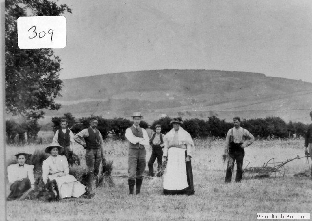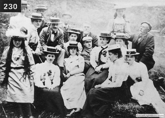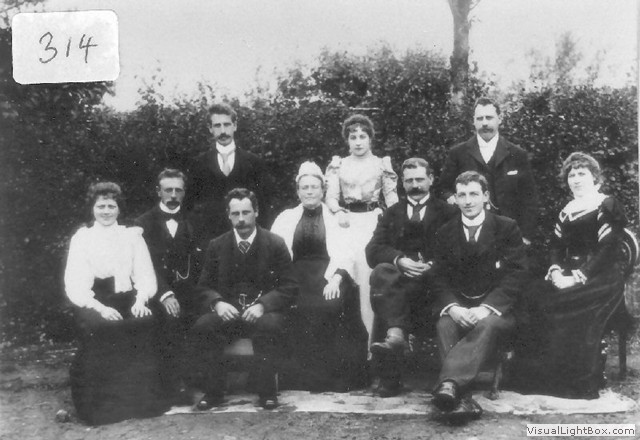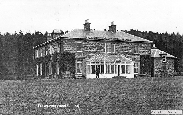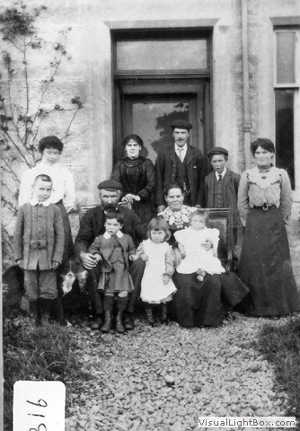 Flowerburn House in background. William Grigor, ?, Donald Grigor, ?, Mrs Catherine Grigor, Katie Grigor, ?, Kitty Whyte