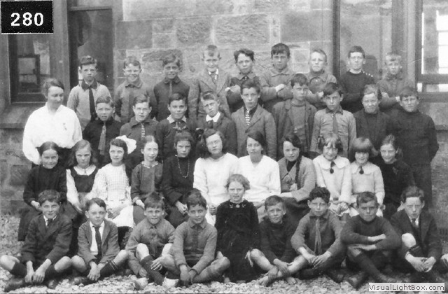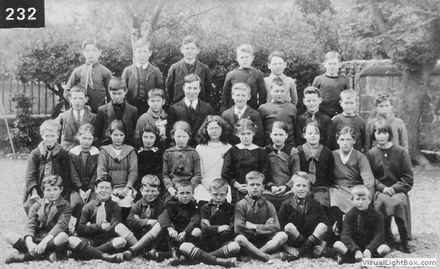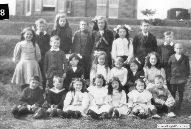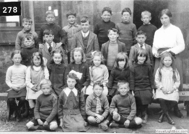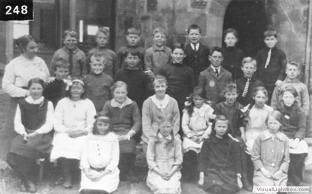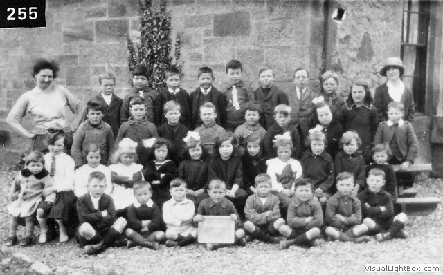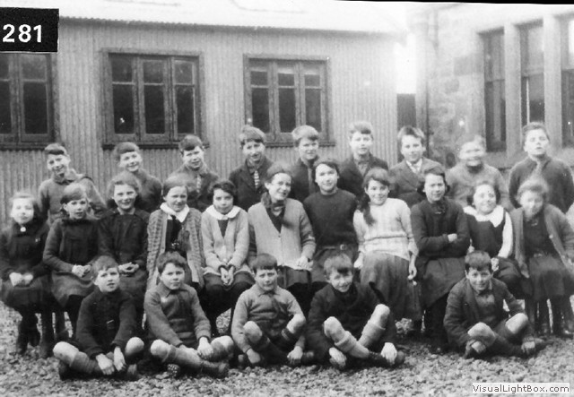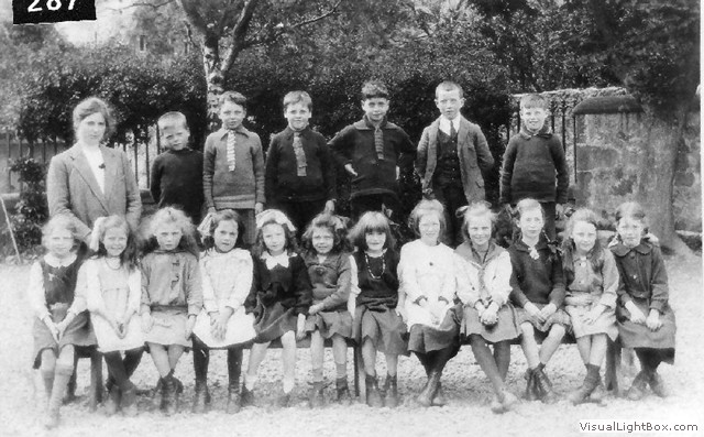 Pupil group. Delia Grigor, Ishbel Fraser, , , Kenny Macdonald, Donald Mackay (Puck), Jenny Mann, Miss Kemp, Dolly Mackey, Margaret Campbell, Violet Gordon, Ciss Macleman, Chris Munro, Bernie Junor, Jessie Moir, Mary Dunoon, Roddy Fraser, James Jack, Louie Civel, Alex Maclennan (Boultie)