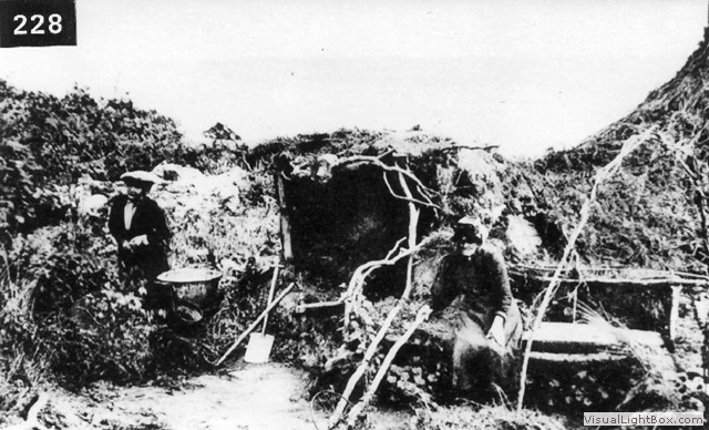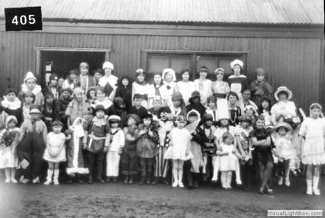 Fancy dress party c1924-25 held in the "Comrades Hut" Neil Wilson (in sailor suit) with his sister Peggy. Hannah Alexander (nee Mackenzie) middle towards right in tall white hat dressed as Wills cigarette.