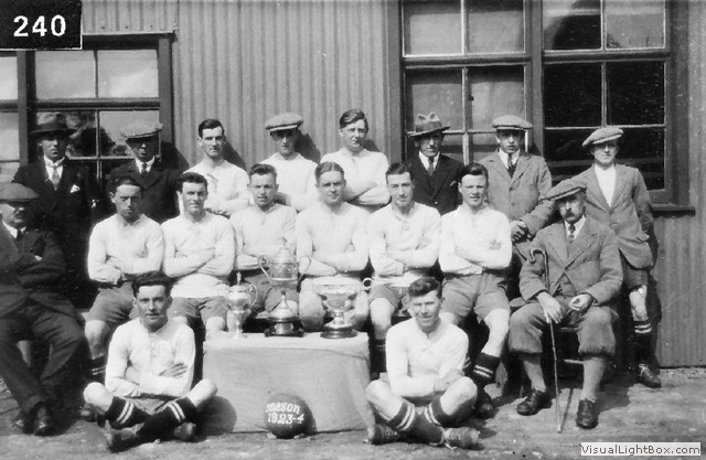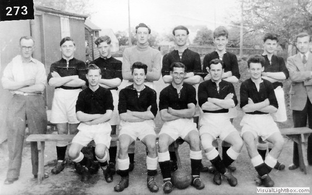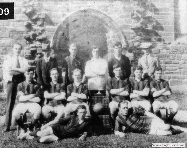 Football team. Back row: Effie Sinclair, A Urquhart, J Forsyth, Ross Miller, Jimmy Lumsden, Hugh More, Allie Sutherland, Fowler Wilson. Front row: Sandy Brooks, Douglas Miller, O Canney, Dodo Wilson, Donnie Sutherland