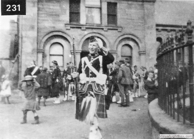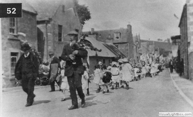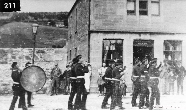 Fortrose - Fife and Drum band, as part of the opening of the Railway and Station Road, passing Macleod's Bakery, High Street