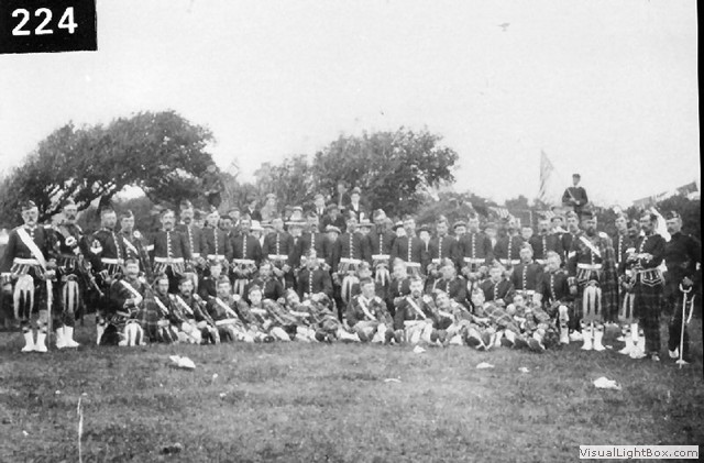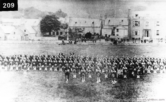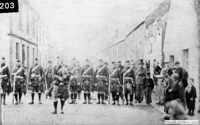 Fortrose Cathedral Green pre1900 Inspection of volunteers. Brass Band in front. Taen before he building of Provost Geddie's shop and house (now Co-op)