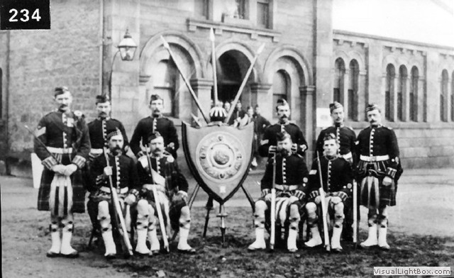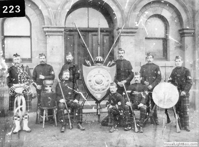 Fortrose Drill Hall in Cathedral Square. C Company volunteers with Seafield Shield and Bannockburn Challenge Shield and cups after very successful year. 1897
