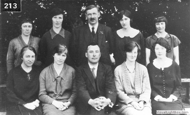 Class group unknown year. George Anderson. 3nd row: Croline Anderson, Isobel MacKinnon, Mary Gallie. 2nd row: Adra Munro, Mairi Birnie (nee McIver), Sybil Campbell nee Miller, Peggy Mackinnon, Phemie Urquhart, Mary Anderson. Sandy Jack, John Anderson