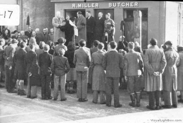 George V playing field - presentation of £300 cheque to Town Clerk.Left to right: Bailie Dobson, Mrs Dobson, Mr MacDowall, Provost Anderson, Bailie Rowat, Lady o'Connor, General Sir Richard o'Connor, Rev William Craig, Mrs Craig.