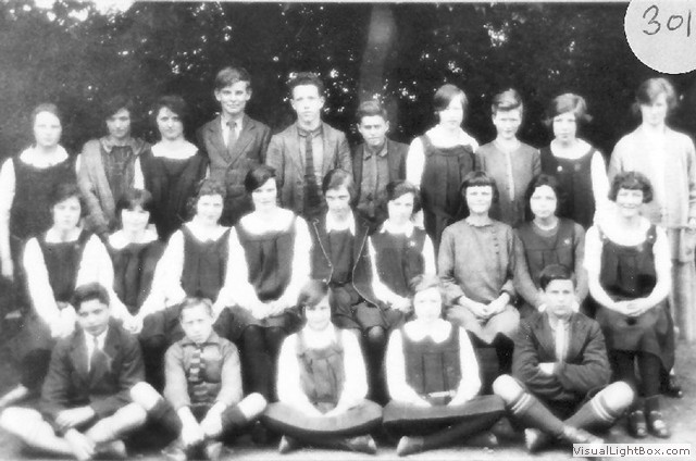 Class group unknown year - 2nd row from back, 4th from left, Eva Davidson. 2nd row from front, last on right, Peggy Craig